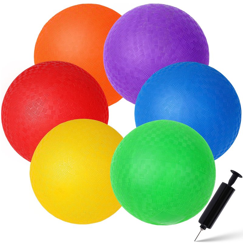 - Package Contents: This ball set comprises 1 playground ball in different colors and 1 air pump (Placed in side of the handle of pump). The ball boasts a 5-inch diameter (after fully inflating) with a textured, no-slip grip, and vibrant colors.