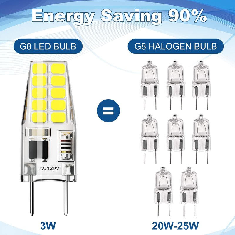 - 【Energy Efficient】 G8 led bulbs 20w-25w equivalent but only use 3 watts, saving 90 percent electric energy.