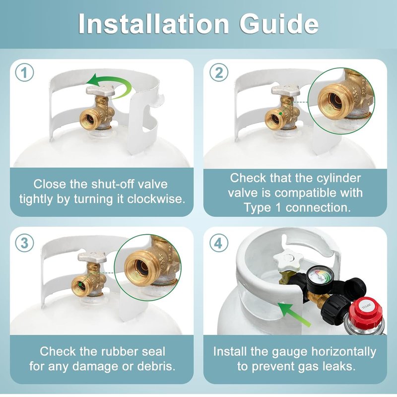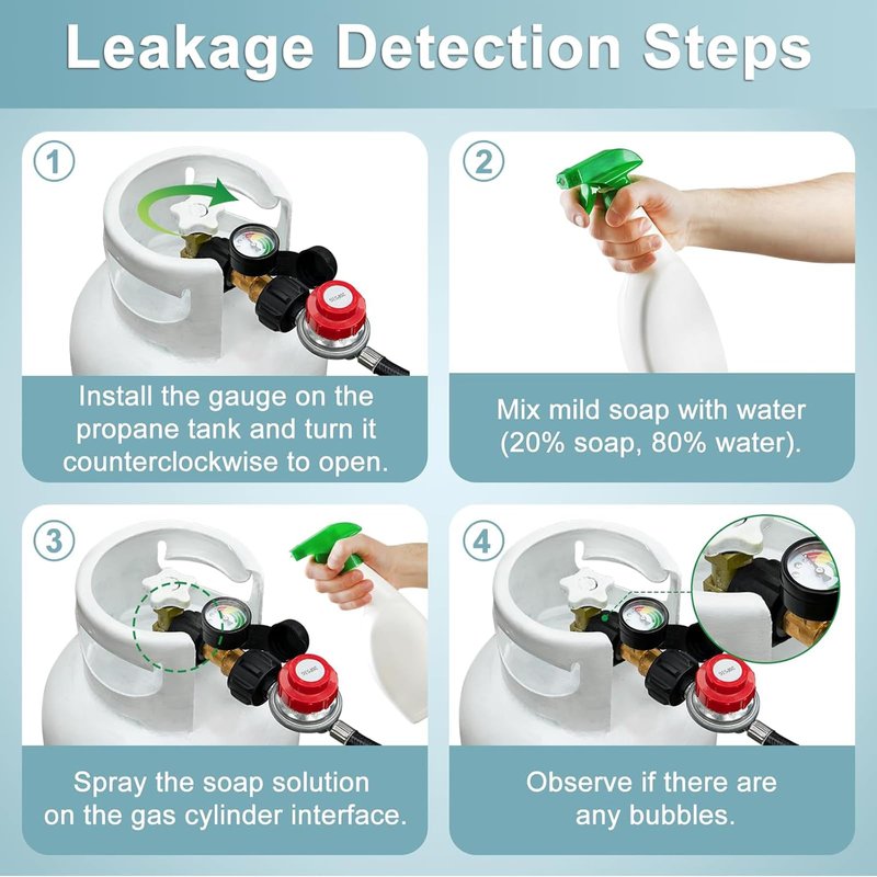 Description Propane regulator hose with gauge, Connects gas appliance to 5lb-20lb LP tank New version, propane tank gauge can detect dangerous leaks, avoid safety issue by the feature of gauge detecting Read on fuel level at glance. Never run out of gas not knowing Fits most gas grill, patio heater, fire pit , water heater, and more low pressure device that has 3/8" male flare connection Gas flow is kept stable below 80000 BTU/hr; QCC-1 x 3/8'' Female Flare Fitting Great for BBQ, camping, tailgating, heating needs or having an outdoor cookout. Feature Outlet Pressure:11" W.C. Flow Capacity: 80000 BTU/Hr Length: 2 feet Attention: 1.Warning!!! For your safety ALL propane appliances like gas grills, heaters and stoves are OUTDOOR Use. 2.FULLY TIGHTENED at both propane tank side and grill side before using on your propane appliances to prevent leakage. 3.To check and make sure the hose is away from the OPEN FIRE before installing to your appliances. 4.Keeping the hose away from HIGH TEMPERATURE.