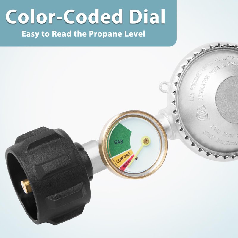 This is upgraded 5ft gas grill regulator hose with propane tank gauge. Do not need to buy extra gas meter, saving your money. 1. Please check to see if the propane tank has the standard propane valve fitting QCC1/Type1, like a Propane Smoker, Gas Grill, Heater, Fire Pit.Then see device if the other end is a 3/8inch Male Flare Fitting. 2. The output pressure of the regulator is set to 11 inches water column which equates to approximately. 3. Low pressure means the high pressure in your propane tank will be reduced and regulated to the correct pressure for your burners to work as designed. 4. Great for BBQ, camping, tailgating, heating needs or having an outdoor cookout. 5. Our propane regulator with hose has excess flow protection for your safety and will automatically shut off. Attention: 1.Keeping the hose away from HIGH TEMPERATURE. 2.FULLY TIGHTENED at both propane tank side and grill side before using on your propane appliances to prevent leakage. 3.To check and make sure the hose is away from the OPEN FIRE before installing to your appliances. Product Specification: Outlet Pressure:11’’W.C. Flow Capacity: 80000 BTU/Hr Length: 5 feet /60 inch(length of rubber hose only) Please double check your appliance connection if is 3/8’’ Male Flare Fitting Connector. Note: For Outdoor Use Only.