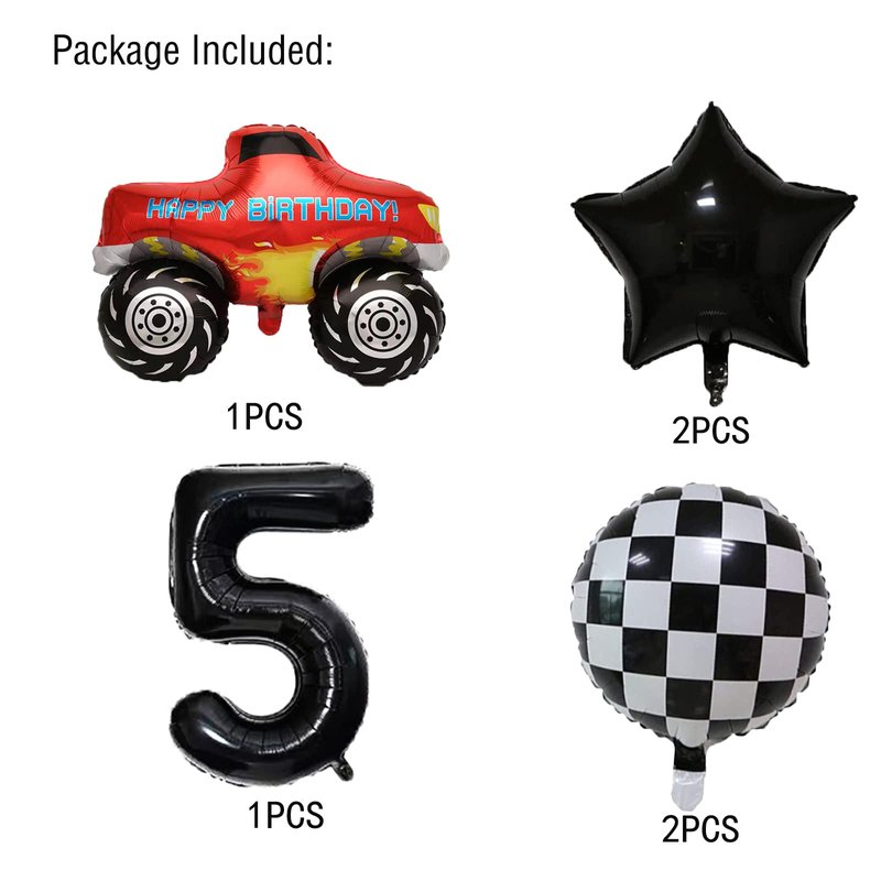 - Package Included: 1PCS Giant Size Monster Truck Foil Balloon,2pcs Round Racing Foil Balloons, 2pcs 18’’ Black Star Balloons, 1PCS 32’’ 5 Number. Totally 6PCS. Perfect for a Monster Truck Theme Party.