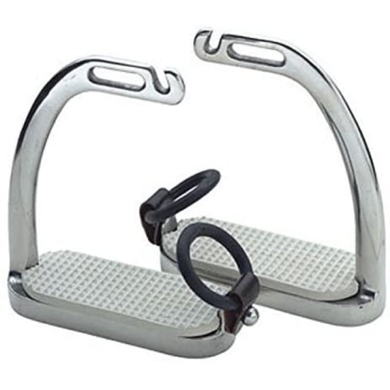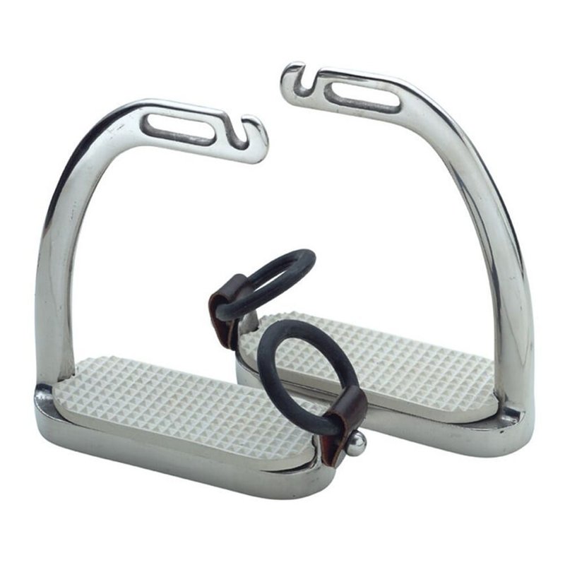 Safety stirrups designed primarily with children in mind. The thick rubber band will detach easily in the event of a fall for greater safety and to help prevent feet from getting caught in the stirrups. Stainless steel with a high quality finish.