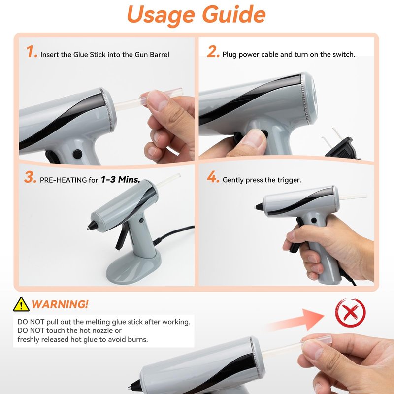 - 【Simple Operation】: Ergonomic design handle offers comfortable operation. Its compact and lightweight features help you use easily. Just insert the glue sticks, connect your hot melt gun to the power, pull the trigger to heat up. The glue gun nozzle with rubber protector to prevent burns.