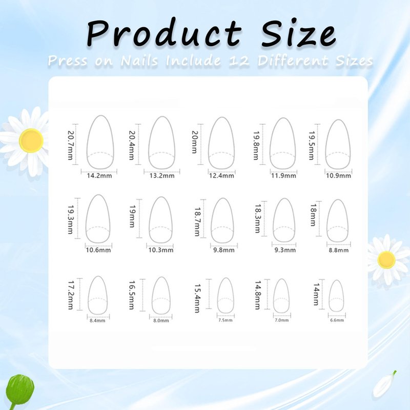 - After cleaning your short almond acrylic nails with cleaning pad, choose the fit false nails size for you. Stick the adhesive double-size stickers on the nails, press for a few minutes, you'll get a nail salon-like nails in just a few easy steps.