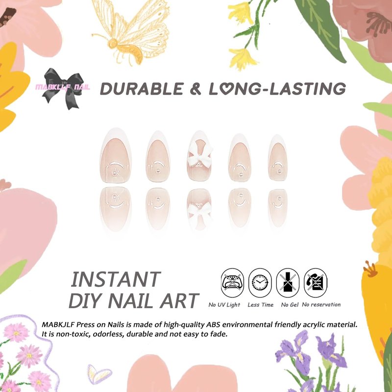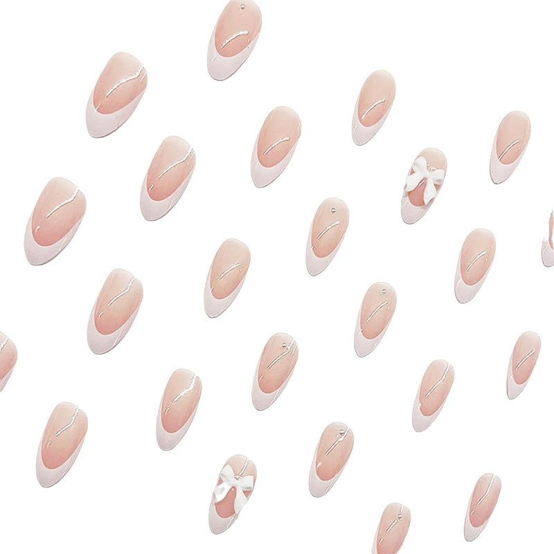 Short Press on Nails Almond MABKJLF French Tip Fake Nails Nude Full Cover Bow Charm False Nails with Designs Glossy Glue on Nails Petite Cute Acrylic Nails Artificial Nails for Women Girls 24Pcs