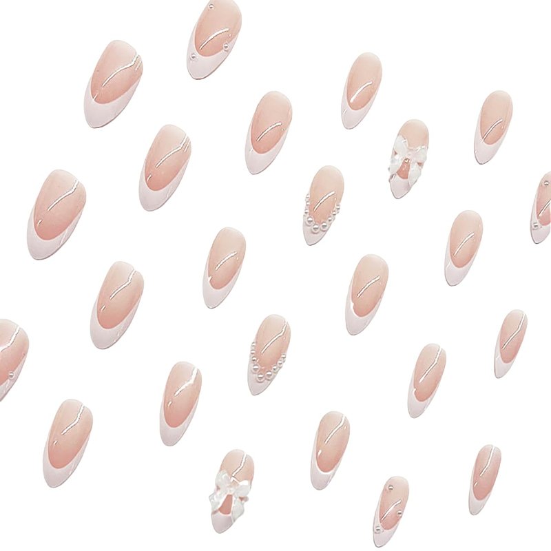 Short Press on Nails Almond MABKJLF French Tip Fake Nails Nude Full Cover Pearl Bow Charm False Nails with Designs Glossy Glue on Nails Petite Cute Acrylic Nails Artificial Nails for Women Girls 24Pcs
