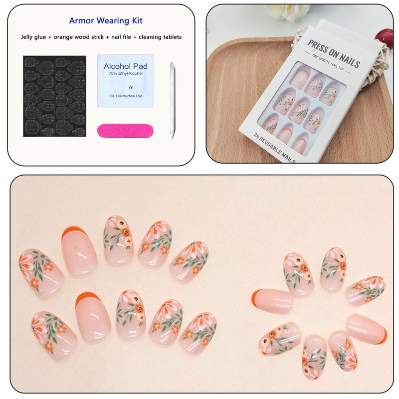 - With 24 oval press on nails short presses per box, a sheet of jelly glue, 1 cuticle stick, 1 double-sided nail file and cleaning pad, this set contains all the tools you need to sharpen your nails.