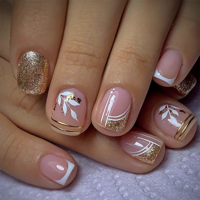 Short Square Nails Press on Rchosvam Square Fake Nails French Gold Glitter Stick on Nails Gold and Leaves Glue on Nails with Design for Womens Girls 24pcs