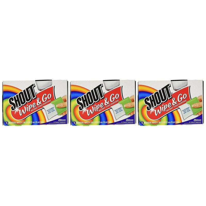 Product Description Shout Wipes are made portable, so you can use them to remove on-the-go stains right away. Wherever stains happen, Shout Wipes are there. Safe for all colorfast washable and dry cleanable fabrics.Textured wipe lifts away stains!12 individual wipes 4.7 in x 5.9 in (12 cm x 15 cm) eachCountry of Origin: United States. Instructions Remove excess stain. Apply Shout Wipe & Go from the outside of the stain working towards the center. For best results, treat stains shortly after they occur. Place a dry cloth or towel under the stain while treating.Remove excess moisture by blotting with a dry cloth. If a ring appears, moisten Shout Wipe & Go with warm water and gently wipe around the edges of the stain.Blot again to remove excess moisture. For carpeting and fabric with a nap (like velvet & chenille), blot only (do not rub). Warnings Safety Warning: Do not use on upholstered home furniture. Keep out of reach of children and pets. For delicate fabrics (like silk or rayon), test on a hidden area of the surface prior to use. Stains like rust, bleach damage, dried paint, ink or dyes may be impossible to remove.