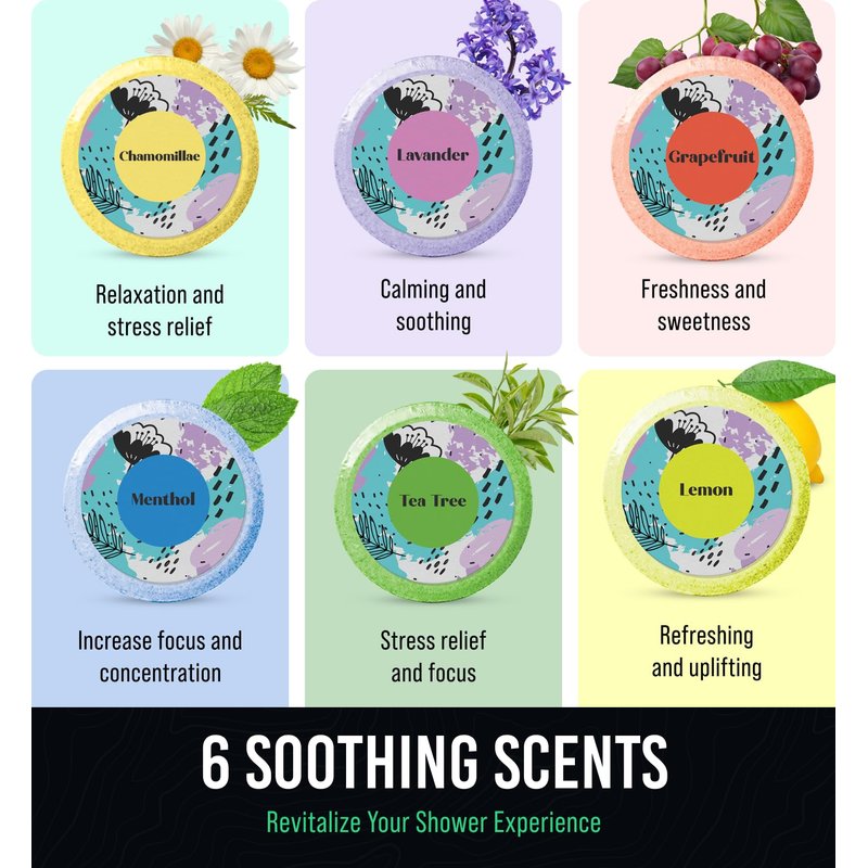 - ✅HANDPICKED & RELAXING --- This 6-pack features 1x Chamomillae, 1x Lavender, 1x Grapefruit, 1x Tea Tree, 1x Menthol, 1x Lemon. It gives you a fancy shower experience with nice smells.