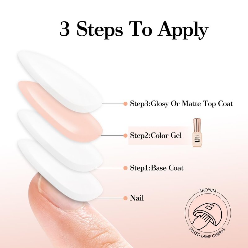 - SHEER PINK GEL POLISH: Apply several layers to build up the color from clear transparent to solid opaque. Cure with UV LED nail lamp for 60s to dry.