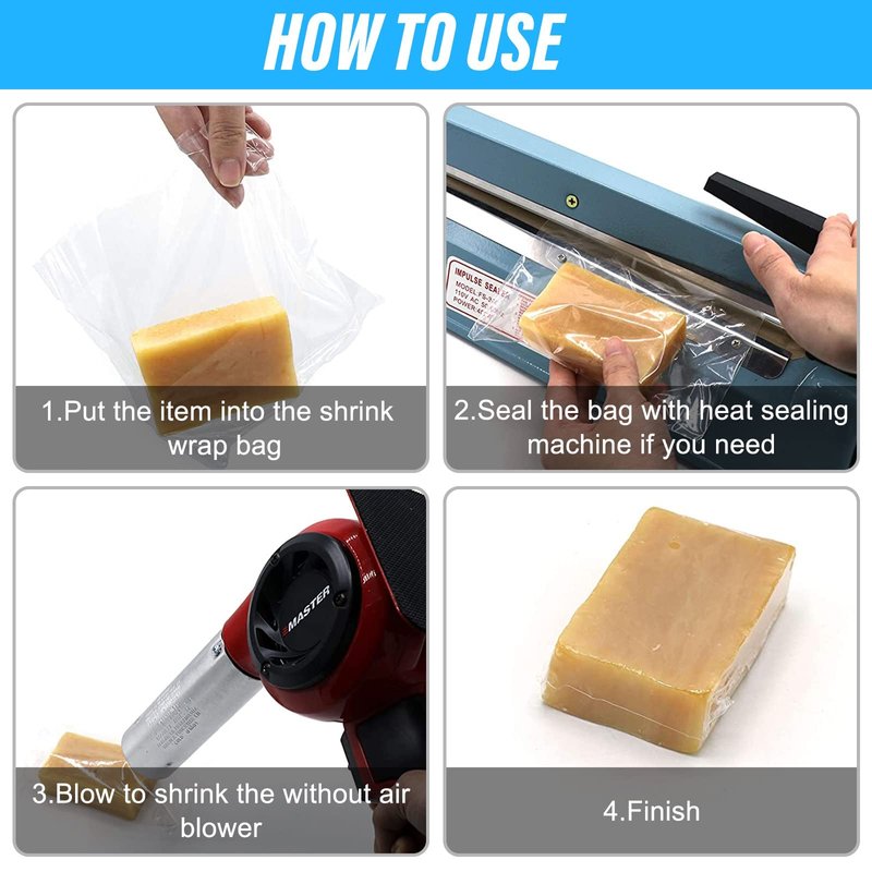 - 【Easy to use】 The shrinkage rate is high, just put things in the shrink bag, and then use a heat gun, hot air tube or hair dryer to shrink and seal the bag evenly until it is completely closed.