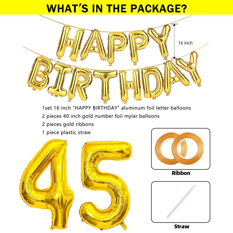 PACKAGE:Big Giant Jumbo Gold Mylar Foil Letters and Numbers Balloons:1 piece 37 inch number "4" gold Balloon, 1 piece 40 inch Number "5" gold Balloon,1set 16 inch gold "happy birthday" letter balloons with 2 pieces gold ribbons,1 piece straw.giant happy birthday balloon sign and Jumbo Number balloons are a goodchoice for Birthday Party Decorations Supplies,lets you celebrate partymoments with children, friend, andfamily