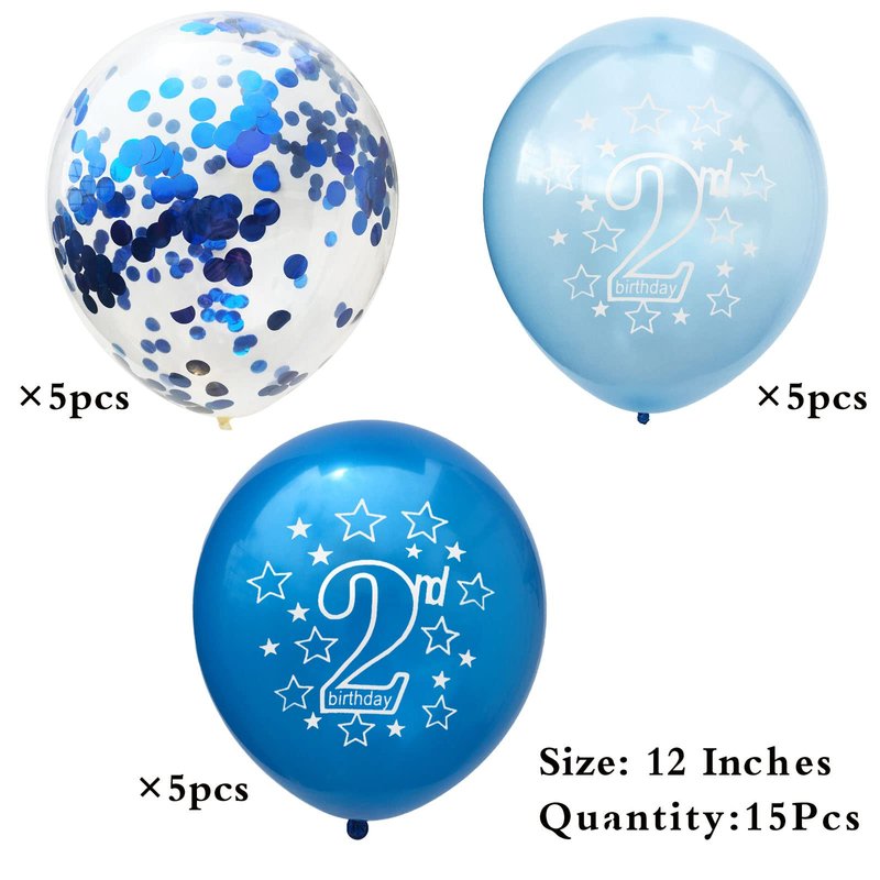 15 pieces Birthday Party Balloons Package:5 pieces 12 inch navy blue latex balloon printed with the words "2nd Birthday" 5 pieces 12 inch light blue latex balloon printed with the words"2nd Birthday"5 pieces 12 inch blue confetti latex balloons,coming with 1 roll ribbons.