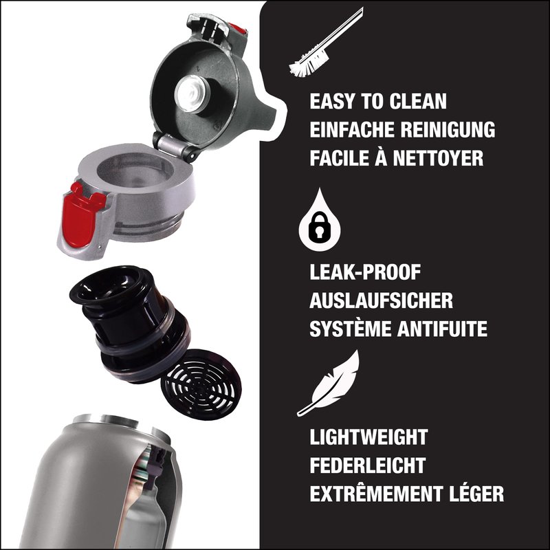 - LEAKPROOF WATER BOTTLES: This insulated water bottle with handle is fully spillproof. Thanks to its ONE lid: Carry, open, drink, close, and repeat only with one hand. Perfect in an urban environment or as a camping water bottle.
