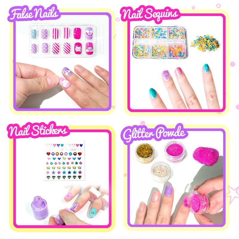 - 🌈Amazing Nail Art Studio for Girls: Every girl hope to become beautiful, including just their simple nail -1 nail handbag,1 nail dryer, 5 nontoxic nail polish, 1 sheet of nail stickers for nail art, 1 pedicure tools toe separator&file, 6 nail sequins, 3 boxes of nail glitter powder, and 12 false nails.