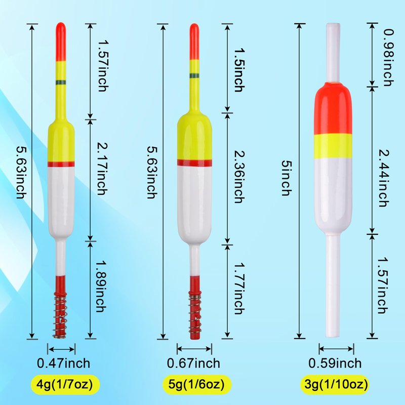 - PACKAGE: 5/10pcs bag,Slip Bobbers fishing bobbers are 3 Sizes available,2.17"X0.47"X5.63",2.36"X0.67"X5.63",2.44"X0.59"X5",Perfect for Crappie Panfish Walleyes Bass Trout Fishing