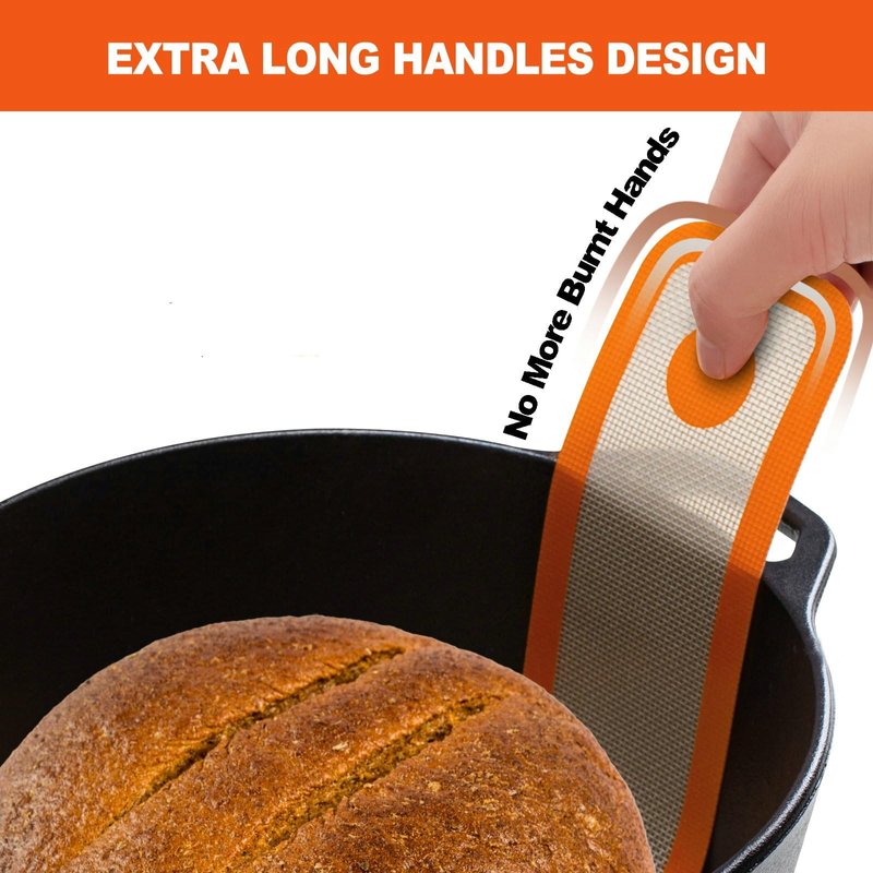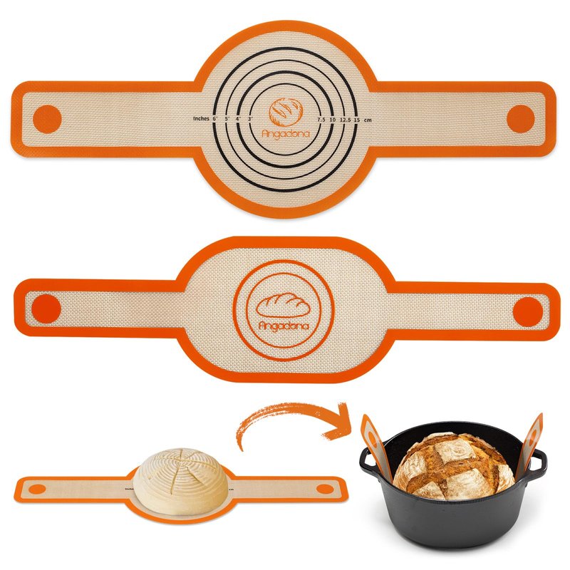 Angadona Oval and round Silicone bread sling oval for dutch oven are made of best Japan Silicone. With updated extra Longer and wider handle design for more safety transfer dough to Dutch oven pot and avoid burn your hands when Bread in and out Dutch Oven Pot. Silicone bread baking mat for dutch oven is Non-Stick in surface. Can baking any food. And Easy clean with hand or Dishwasher safe. Good choice for replacement the parchment pater to save money and Planet. sourdough silicone bread sling will help you easy baking sourdough bread like professional.