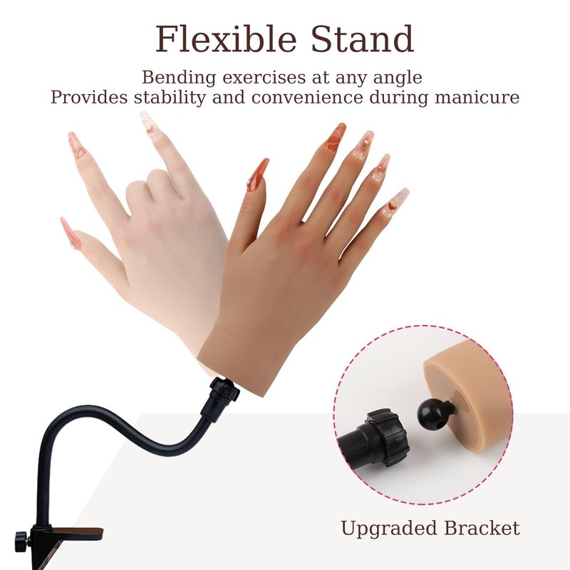 - Comes with a Stand - The silicone nail practice hand model includes a removable and adjustable stand, so the hand can stand on the table securely. It can be bent at any angle, so you don't need to buy a table clip separately, making it more convenient to use.
