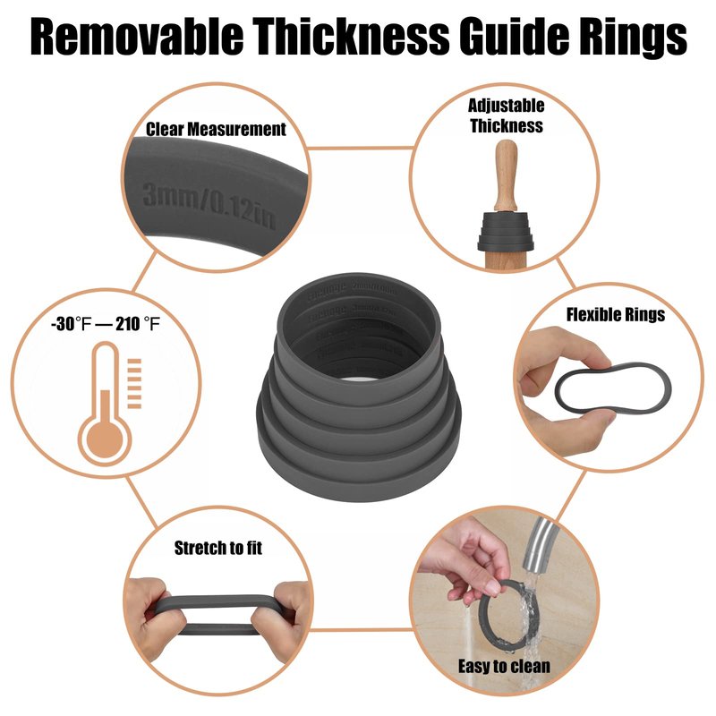 - 【Clear Measurement Guide】There are 5 sizes of the rolling pin thickness rings: 2mm(0.08”), 3mm(0.12”), 5mm(0.2”), 8mm(0.31”), 10mm(0.39”), which is embossed on the inner side of each silicone ring. With the adjustable dough rings, it is easy to roll out dough to the expected even thickness and produce evenly baked bread, biscuit, pie top, tart base, chapatti, dumplings and noodles like pasta.