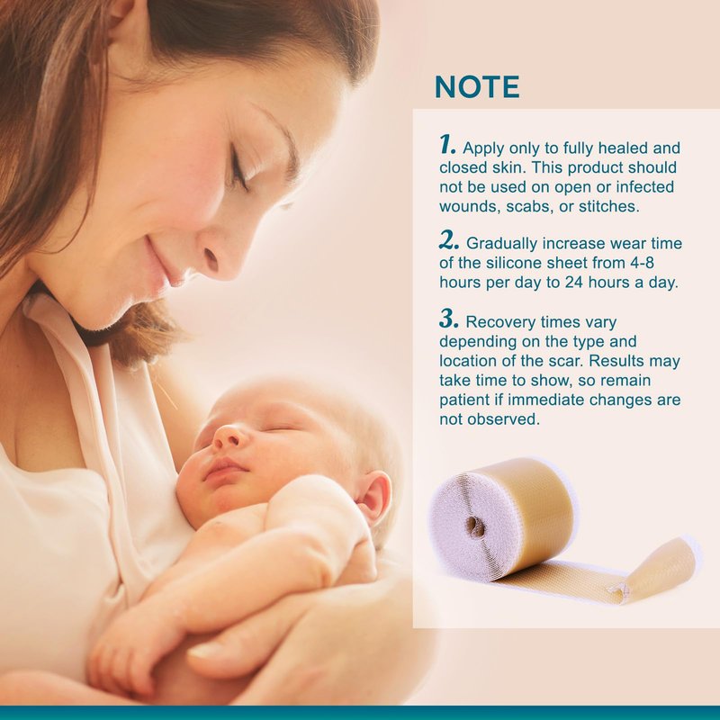 DIRECTIONS: 1.Clean and dry the scar area. 2.Cut the scar sheet to fit the size and shape of the scar. 3.Peel off the liner from the adhesive side of the scar sheet. 4.Do not stretch the scar sheet, but apply it directly to the scar. 5.Wear for at least 12 hours each day for maximum effectiveness.