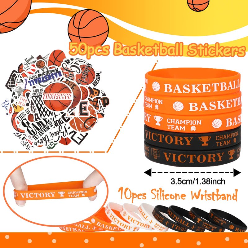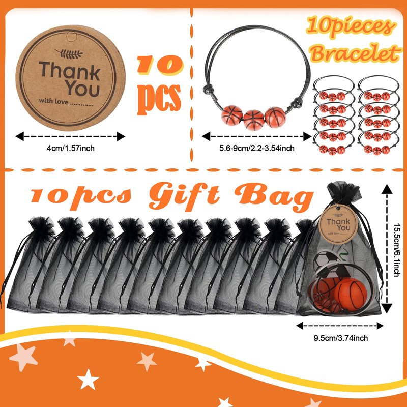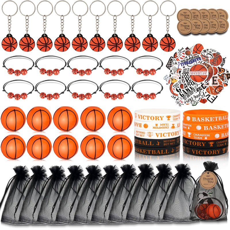 - PACKAGE CONTENT - The basketball party favors set includes 10 PCS fidget spinners, 10 PCS bracelets, 10 PCS goodie bags, 10 PCS silicone wristbands, 10 PCS keychains, 50 PCS stickers, 10 PCS goodie bags, 10 PCS thank you tags. Various basketball gadgets in one.
