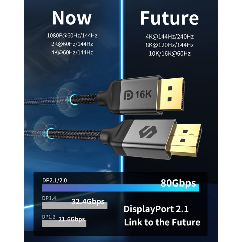 Silkland 8K Displayport Cable 2.1/2.0 supports high resolutions 16K(15360*8640)@60Hz with DSC, 8K@120Hz, 4K@240Hz/165Hz/120Hz/144Hz, 2K@360Hz.Supports all popular graphics cards and monitors.