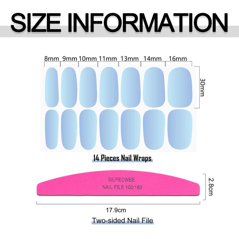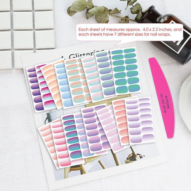- Package Content - 16 sheets nail polish strip + 1pc nail file. each sheet of measures approx. 10 x 5.5 cm/ 4 x 2.2 inches, total 224 pieces and 7 different sizes, a variety of styles and color, let you always keep gorgeous nails.