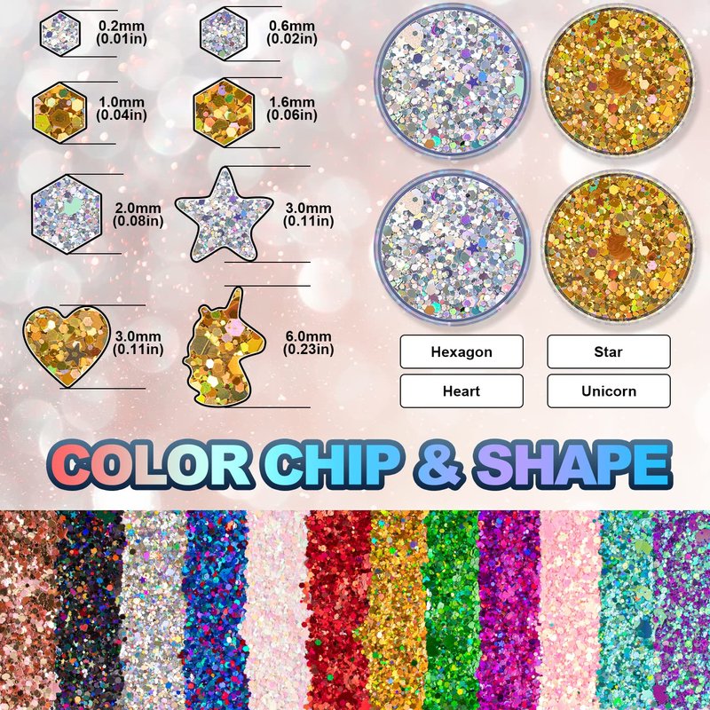 - Holographic Chunky Glitter:the glitters consist of HEXAGON; STAR; HEART and UNICORN. 8 boxes sizes are 0.2mm & 0.6mm & 1mm & 1.6mm & 2mm &3mm & 6mm mixed which perfect for body& Face& Hair make up& nail arts decoration