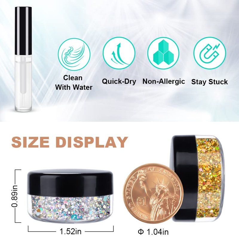 - Quick Dry Makeup Glue: The glue attached to this set is long-lasting and skin-friendly. The glue can be useful for sticking the chunky glitter and glow glitter, and cleaning easily just with some water