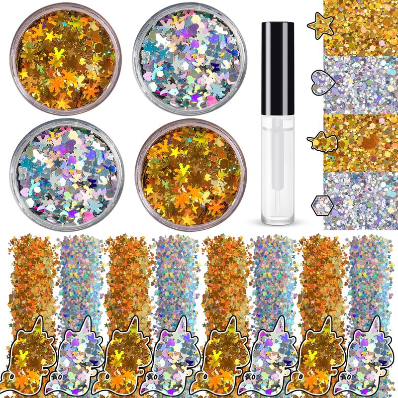 - You Will Receive: 4 pots of cosmetic glitter with 8g/0.28oz, quite enough for mutiple times deco, also, 5ml quick dry glitter glue gel is included