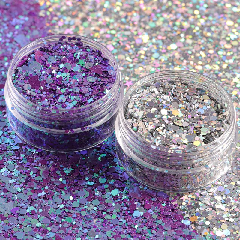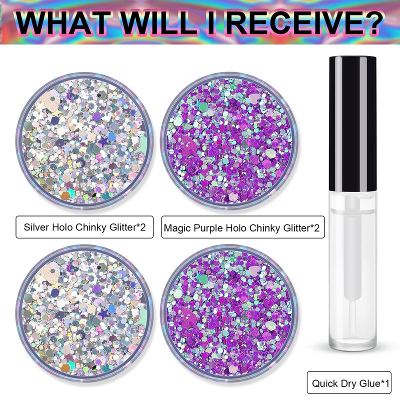 Silver and Magic Purple Holographic Chunky Glitter Cosmetic Body Hair Face Eye Nail for Festival Carnival Concert Beauty Rave Accessories Different Shapes 4 Pots 32g/1.12oz+ Quick Dry Primer Glue Gel