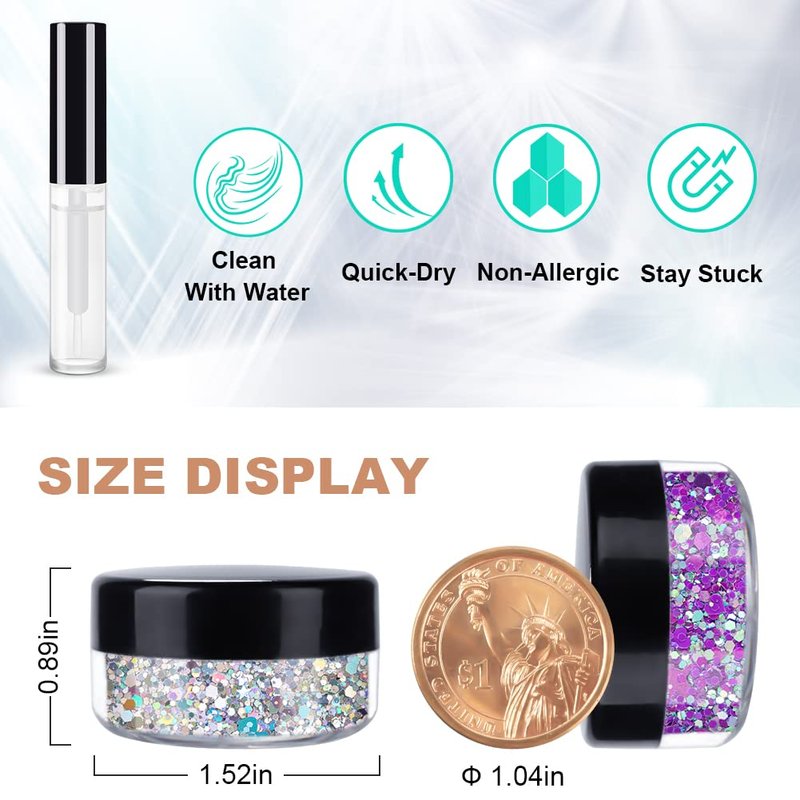 - Quick Dry Makeup Glue: The glue attached to this set is long-lasting and skin-friendly. The glue can be useful for sticking the chunky glitter and glow glitter, and cleaning easily just with some water