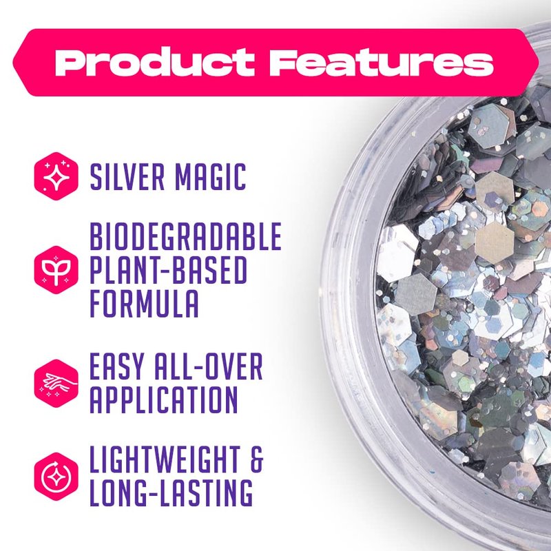 - BIODEGRADABLE GLITTER: Add a little sparkle to your life. Body, face, and hair glitter is your sparkly best friend that will add glittery glam to any occasion or night out on the town! From festivals and concerts to weddings, raves, costumes, and shows – Glitter is sure to make you stand out in a glittering riot of color!
