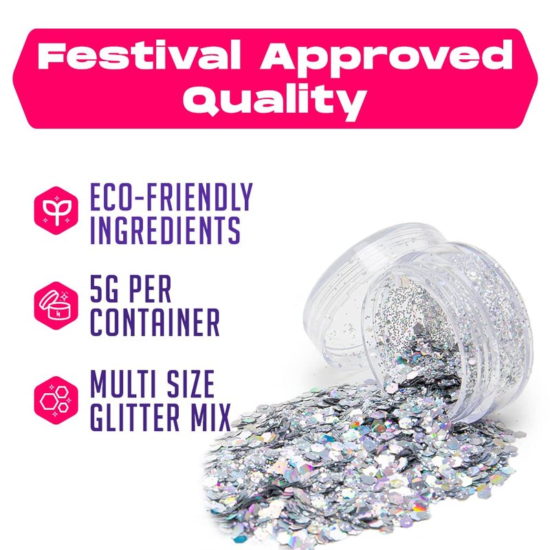 Your search for the best face and body glitter is over! Achieve a festival look with Glitter makeup, or choose from our range of glittery finishes for that all-important extra sparkle! Our exclusive silver gold pink and blue body glitter is made of biodegradable glitter making it safe to wear on the face or body. We have a huge variety of face and body glitter to choose from. Our beloved Body Glitter is the highest quality, longest-lasting, cosmetic glitter on the market. Our Cosmetic Glitter is finely milled for a lightweight, nearly invisible finish that looks great on faces, eyelids, and anywhere else you want to beautify. With our shimmering body glitter, you can shine like a star for your next rave or music festival! Mix, match, and add to any outfit seamlessly.