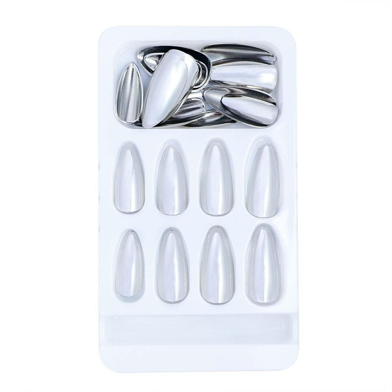 Silver Chrome Press on Nails Almond Fake Nails with Medium False Nails Design Acrylic Artificial Nails Glossy Glue on Nails Full Cover Stick on Nails for Women Girls Manicure Art 24Pcs