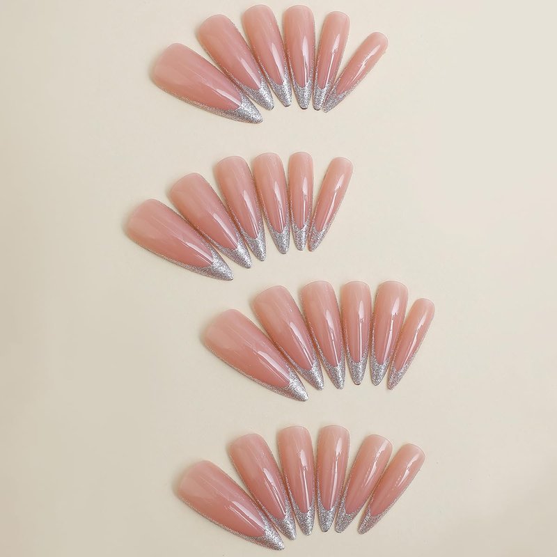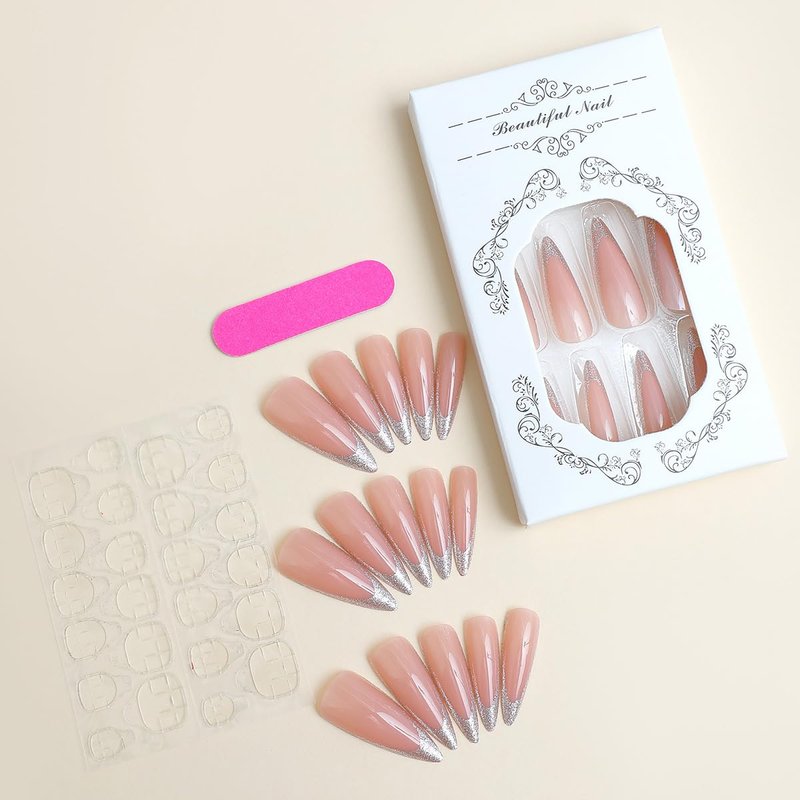 - 【Gel-Made Long Nails】 This sparkly nail set features a gorgeous silver hue with french tips design you'll love. Plus, the long stiletto shape is perfect to dress up or down!