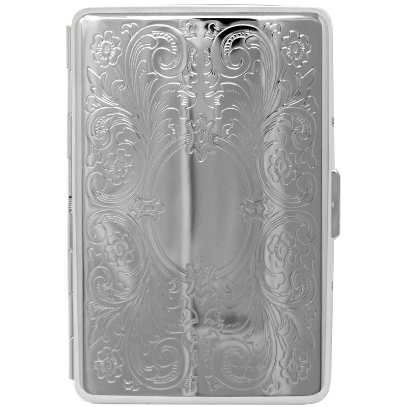 - Gunmetal-plated metallic cigarette case that features an etched pattern on the front. Measuring 4" X 2.5", this case is compact and can accommodate 16 individual cigarettes including 100s (100mm), King (84mm) and Regular (70mm) Size cigarettes.