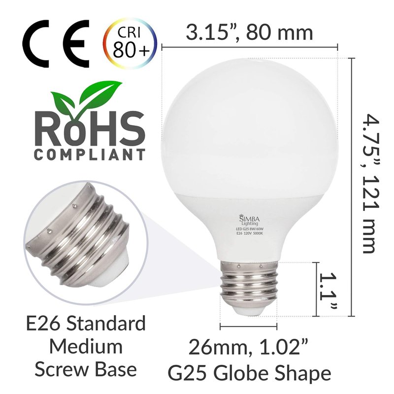 The Simba Lighting® high output G25 Globe light bulb is an excellent addition to your home, office, and retail shops, etc. Often used for vanity makeup mirror lighting. The Globe light bulb is decorative for many general uses too in the kitchen, living room, bedrooms, bathrooms, on desk lamps, standing lamps, you name it. Equipped with Epistar LEDs, this light bulb provides a wide 270° beam angle.