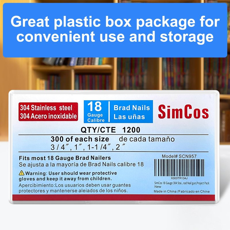 SimCos 18 Gauge 304 Stainless Steel Brad Nails (2",1-1/4" 1", 3/4"), Assorted 1200 Counts for 18 GA Pneumatic or Electric Brad Nailer or Brad Nail gun,Project Pack