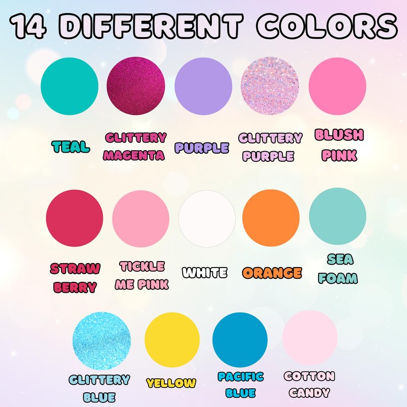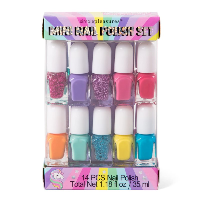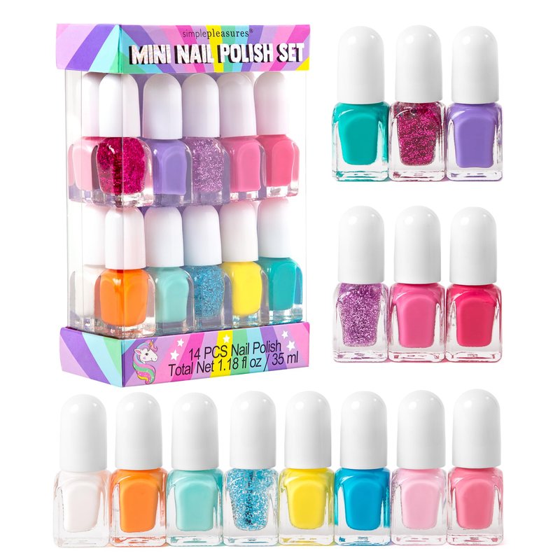 - This Simple Pleasures set of 14 sparkly shades is perfect for your little one's nails. With a range of colors spanning the entire spectrum, you're sure to find the perfect match for any outfit! Three of the colors have a glittery sheen, adding an extra touch of glamour.