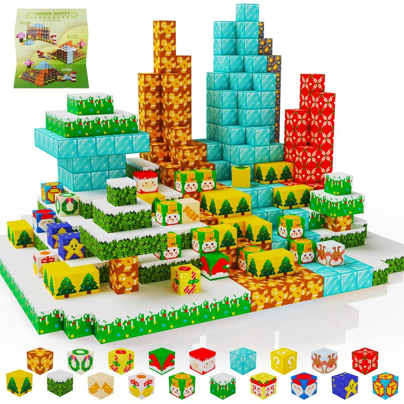 - 2.Design Popularity by children:The design of Our magnetic cubes is inspired by the latest video game trends. A set of Magnetic building blocks contains a total of 18 styles of magnetic cubes, each with different cube patterns and colors. These include Various Christmas elements, have Christmas gifts,Christmas hats, stars, ice cubes,and grass,gifts etc.Magnetic building blocks have strong magnetic force and stable and durable structures.