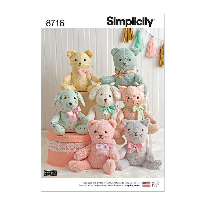 Simplicity 8716 Animals Stuffed Bear, Cat, and Dog Sewing Patterns by Elaine Heigl Designs, One Size Only