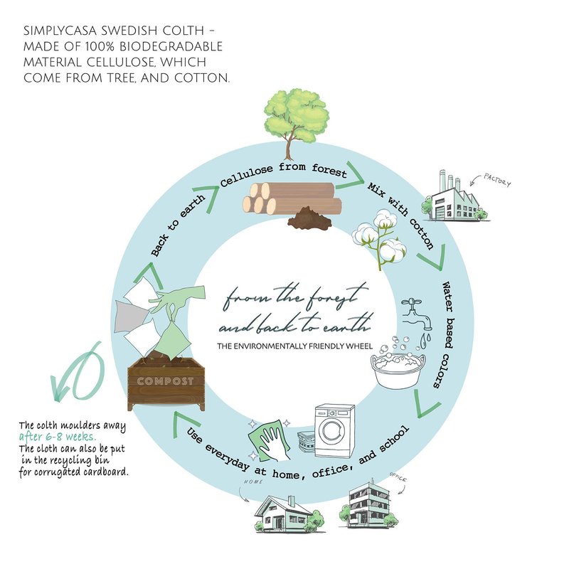 - Eco-friendly kitchen cloth by SIMPLYCASA is made of 70 % cellulose (wood pulp) & 30% cotton, printed with water based inks. 100% Biodegradable. Material made from Sweden. Size: 6 by 7 inches.