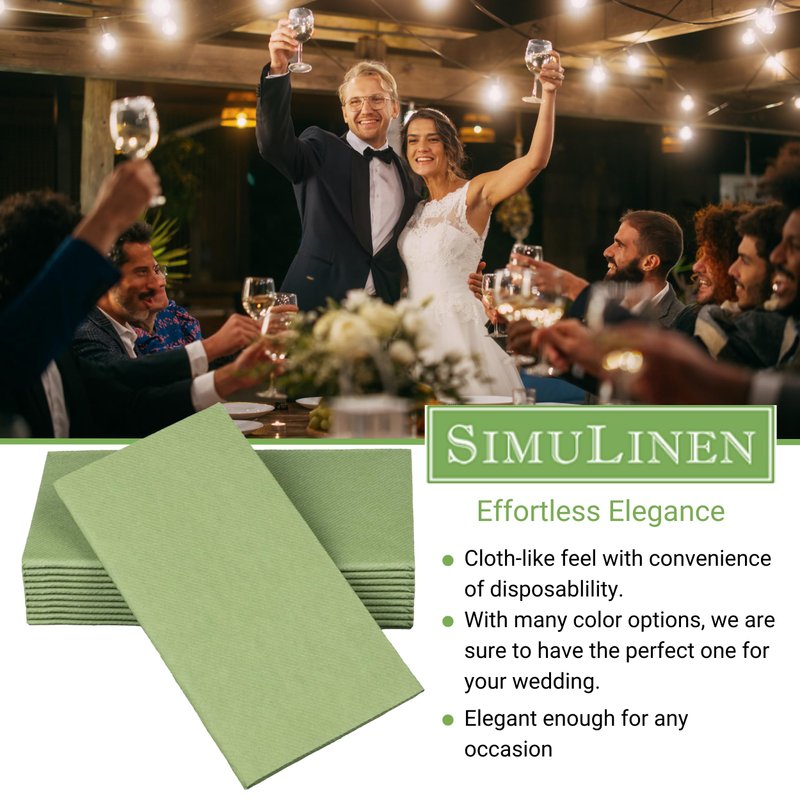 - SimuLinen’s Olive Green Dinner Napkins can be described as Sage Green Napkins, or Eucalyptus Napkins or even Moss Green.These linen feel disposable dinner napkins are cloth like and have a linen feel. They are decorative magenta dinner napkins and are perfect for Christmas napkins and Kwanza napkins and go well with holiday decorations. Our premium colored paper dinner napkins are dinner size and great for wedding receptions and bridal shower napkins as they are very nice party napkins.