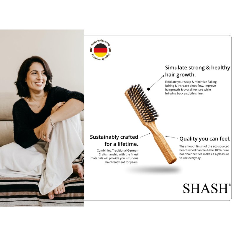 Say Goodbye to Painful Knots and Pulling! When the outer layer of hair is damaged, it opens and becomes tangled with other strands. And if you’ve ever brushed out knots, you know how painful that can be. But using the wrong brush can actually cause spilt ends, making the problem worse. Give hair the gentle care it needs with a Nylon Boar Bristle Brush from SHASH! Featuring bundles of high quality, extra-fine boar bristles and a rounded nylon pin, it effortlessly combs the scalp to remove knots and tangles. Paired with a super-soft rubber cushion bed, it’s amazingly gentle with no pulling, pain or spilt ends. Great for men and women, it’s designed for normal to coarse hair. A natural alternative to cheap plastic brushes, our bristles help evenly distribute sebum across the scalp! Nourished and conditioned, hair is soft, smooth and never greasy. As it adds volume without creating frizz, hair is easier to manage, allowing you to achieve your go-to style. The bristles gently exfoliate your scalp, removing buildup and itchiness while promoting healthy growth. Made in Germany with eco-sourced beech wood, these brushes are in a class of their own! Several layers of sheer lacquer make them strong and long-lasting, while ergonomic handles ensure they’re a pleasure to use. It’s quality you won’t find anywhere else. Why Choose Our Nylon and Boar Bristle Brush? - Gently detangles hair without pulling - Naturally smooths and conditions hair - Exfoliates the scalp - Stimulates healthy hair growth - Made in Germany with premium materials Try Today Risk-Free with Our Satisfaction Guarantee!