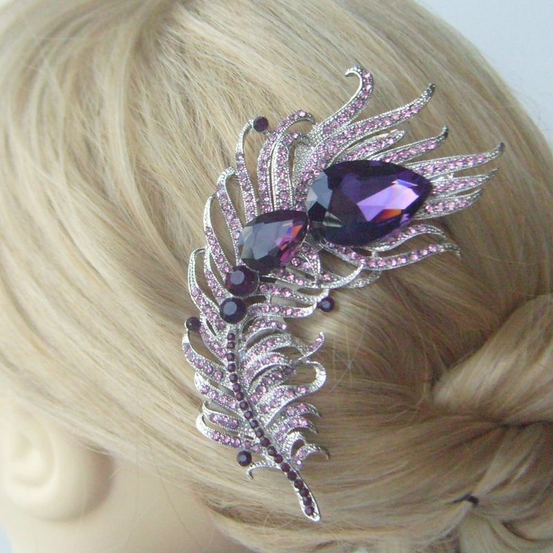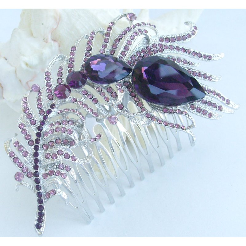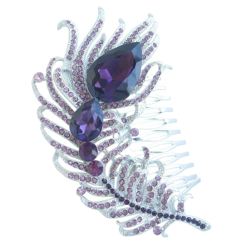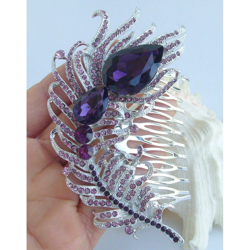 Sindary Wedding Headpiece 4.33" Rhinestone Crystal Bridal Peacock Feather Hair Comb (Silver-Tone Purple)