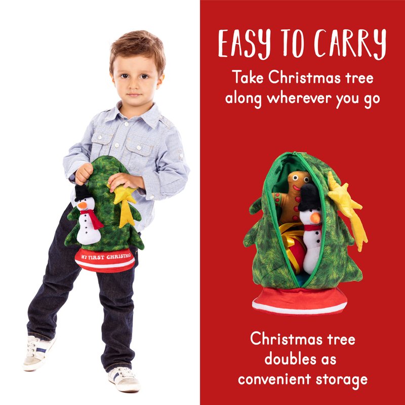 - 🎄WHAT'S INCLUDED: Plush Creations brings you a new fantastic set, "First Christmas". Our beautifully designed plush set comes with 4 ornaments that you can place around the christmas tree! It includes a Plush Christmas Tree shaped carrier that can be used to store the ornaments when your child/ren are done playing. Get your child smiling and animated by hugging, squeezing, and playing with these miniature cute plush christmas toys!