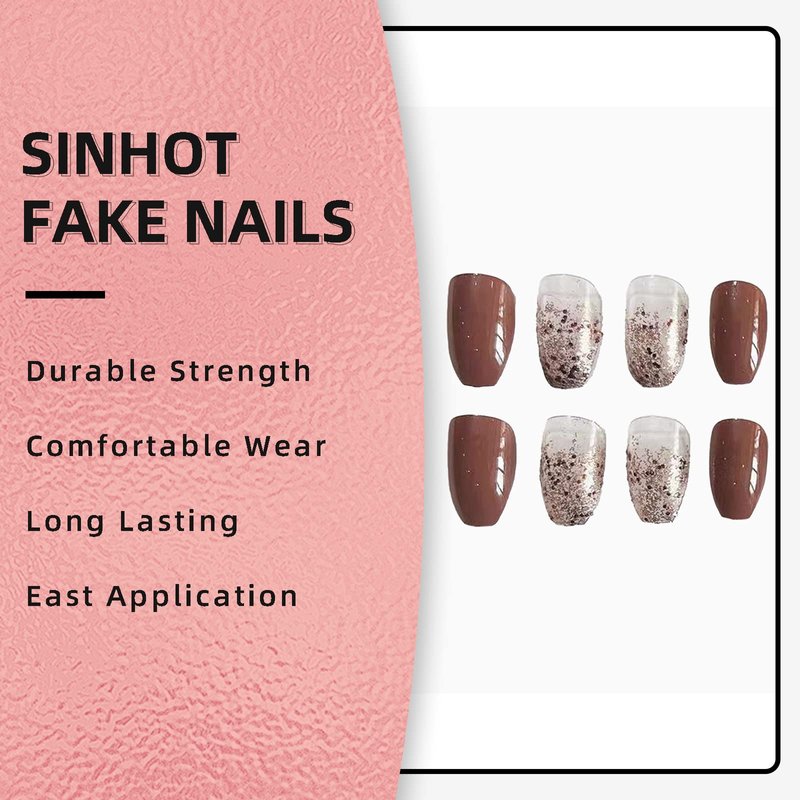 SINHOT Coffin Press on Nails Medium Ballerina Fake Nails Glossy Glue on Nails Brown Gradient Acrylic Nails with Brown Glitter False Nails Designs 24 pcs