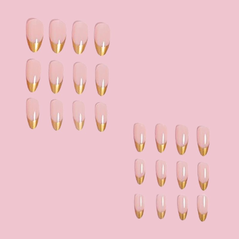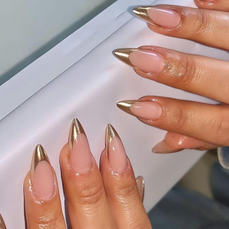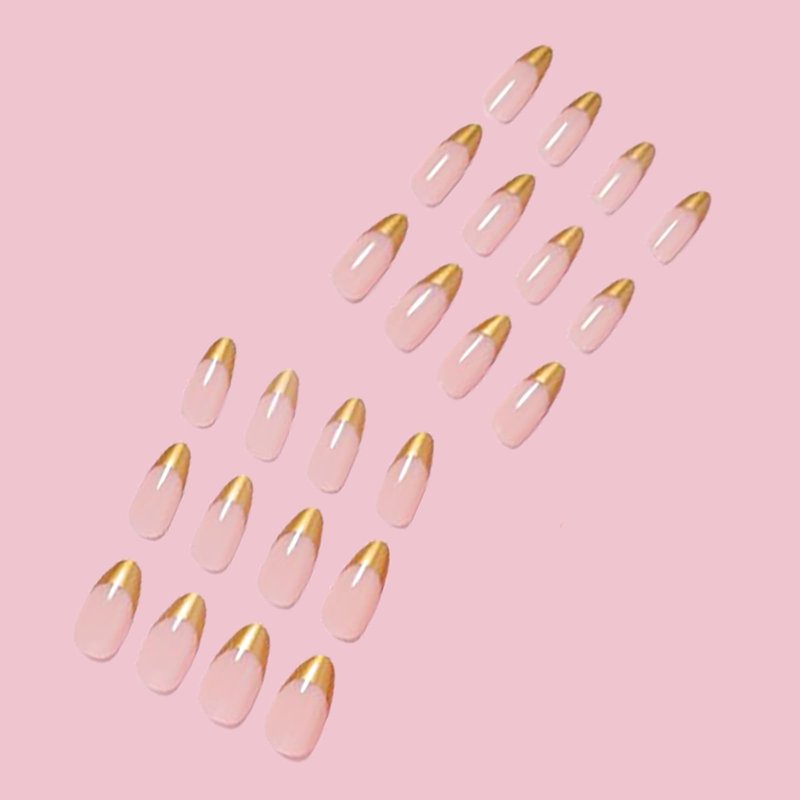SINHOT Stiletto Press on Nails Long Almond Fake Nails Gold Glitter Acrylic Nails Glossy Glue on Nails French Tip Artificial Nails Stick on False Nails with Design 24 pcs